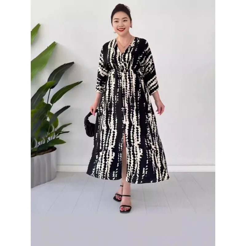 With its refined V-neckline and high-waist A-line silhouette, this dress elongates the figure and enhances femininity with both softness and grandeur. Its premium broadcloth fabric with slight stretch ensures absolute comfort, while the contrasting print delivers the perfect balance between freshness and international style.