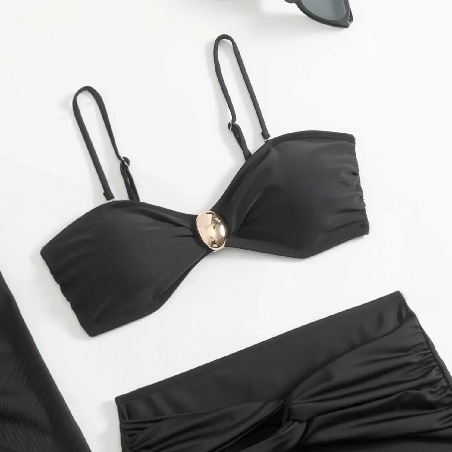 This stylish three-piece set features a strapless bikini top, matching high-waisted shorts, and a sheer mesh long skirt. Designed for comfort and elegance, it offers a conservative yet trendy beach look—ideal for seaside strolls or lounging in style.