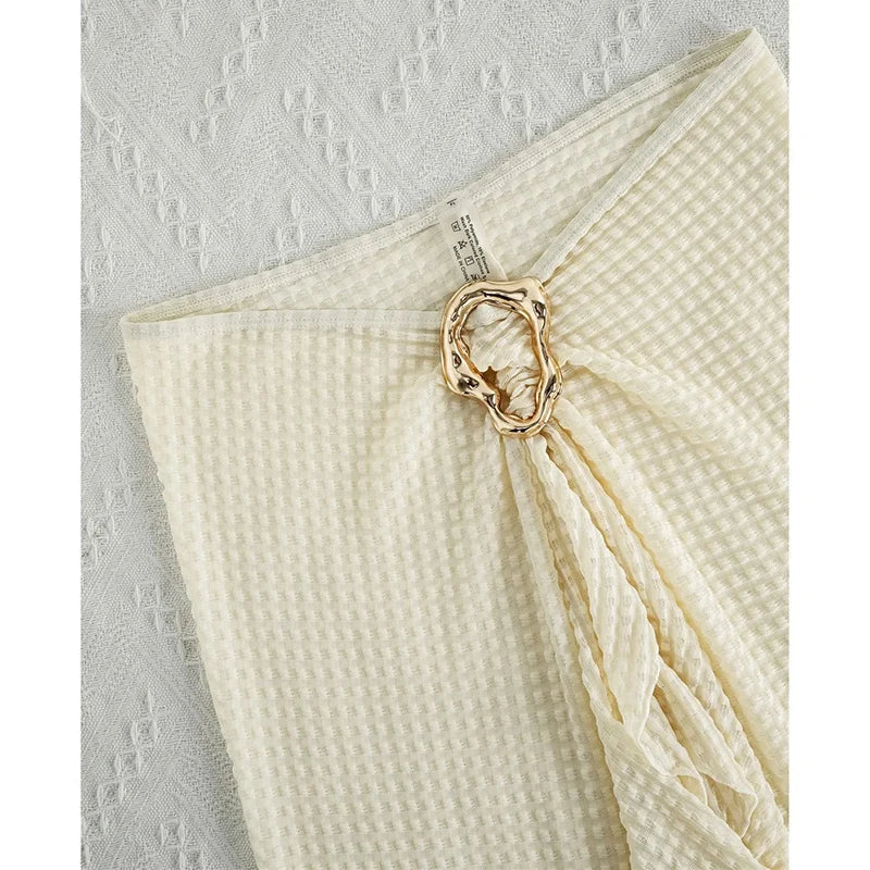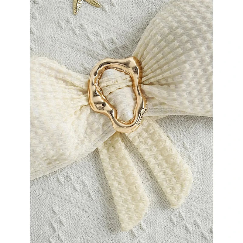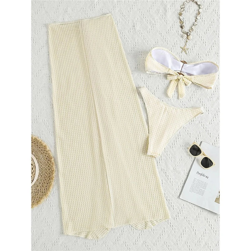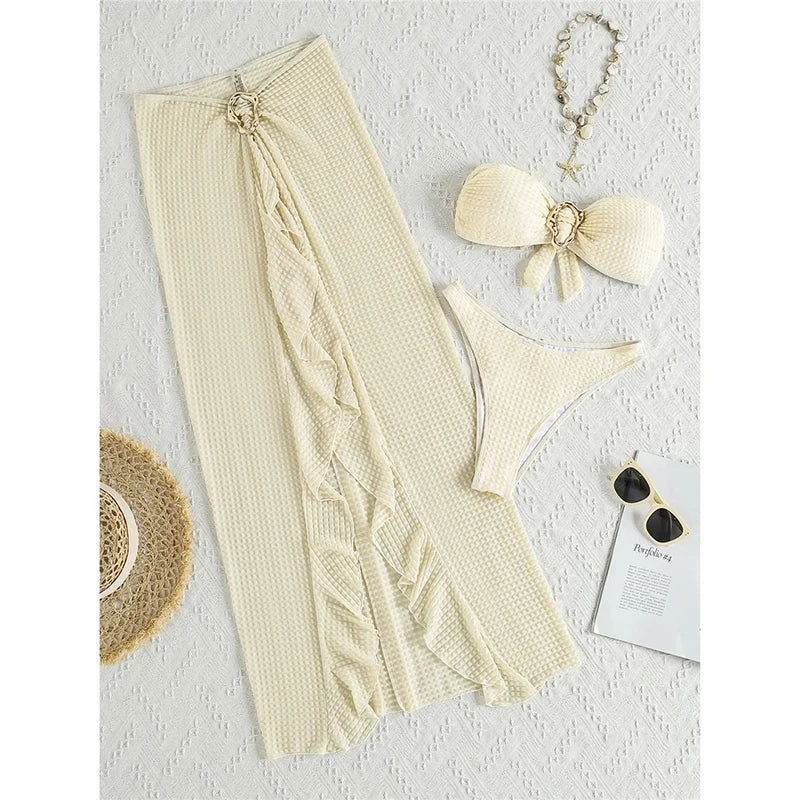Bold and stylish, this 3-piece bikini set features a strapless bandage top with a chic metal buckle, a matching high-cut bottom, and a flirty ruffled slit skirt.