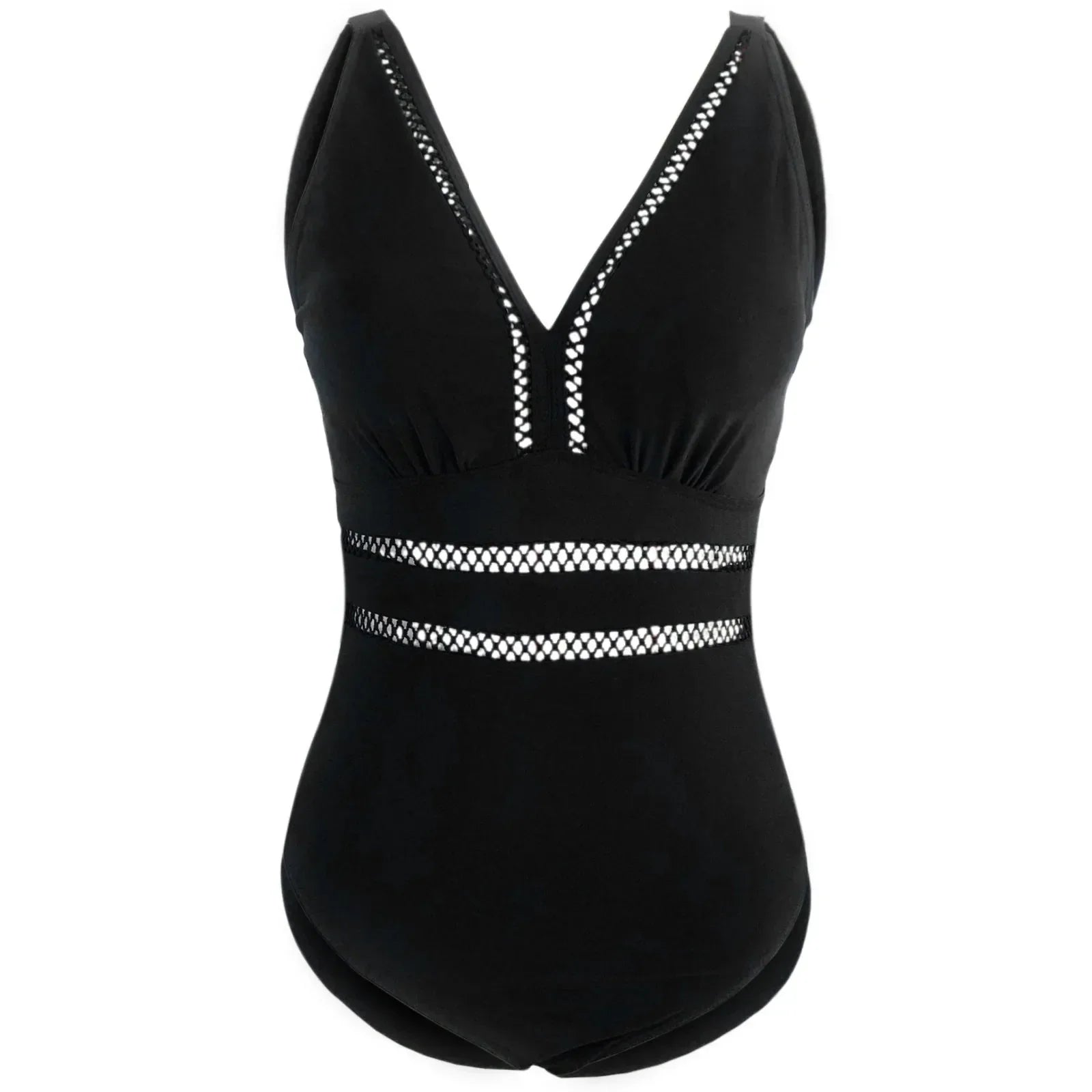 Embrace the beauty of the beach with this swimsuit, designed for confident women with curves. The deep V-neckline and mesh seam detail enhance your silhouette with just the right amount of charm and sophistication.