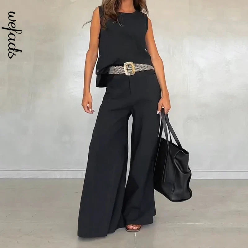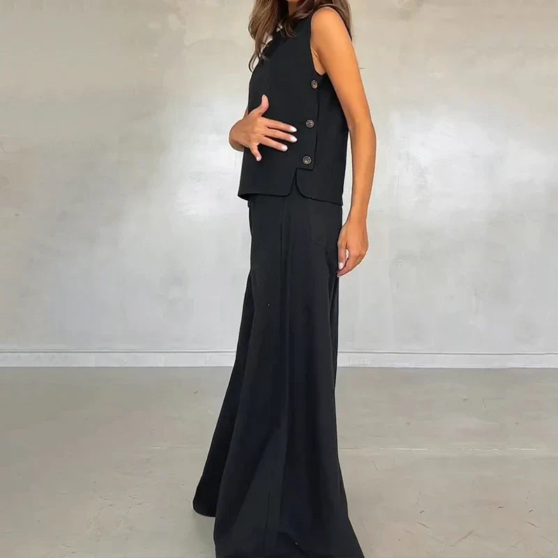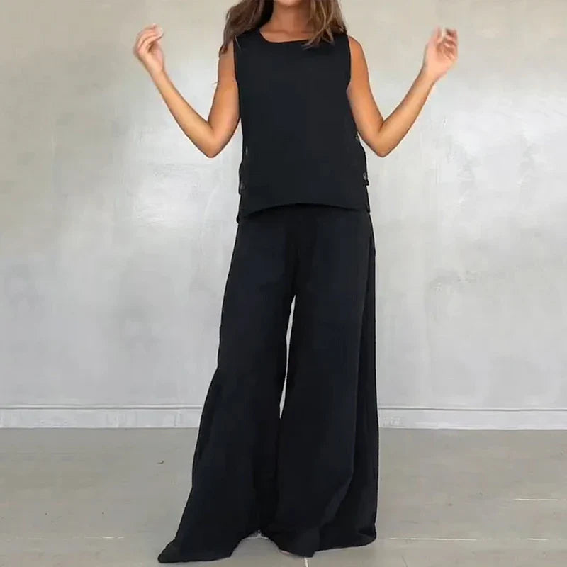 The wide-leg pants with flawless drape offer both fluidity and presence, while the sleeveless blouse adds a touch of modern refinement.
